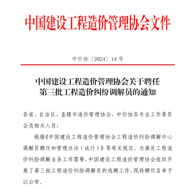 再次获聘中价协造价纠纷调解员,十大买球的正规网站已有三位!