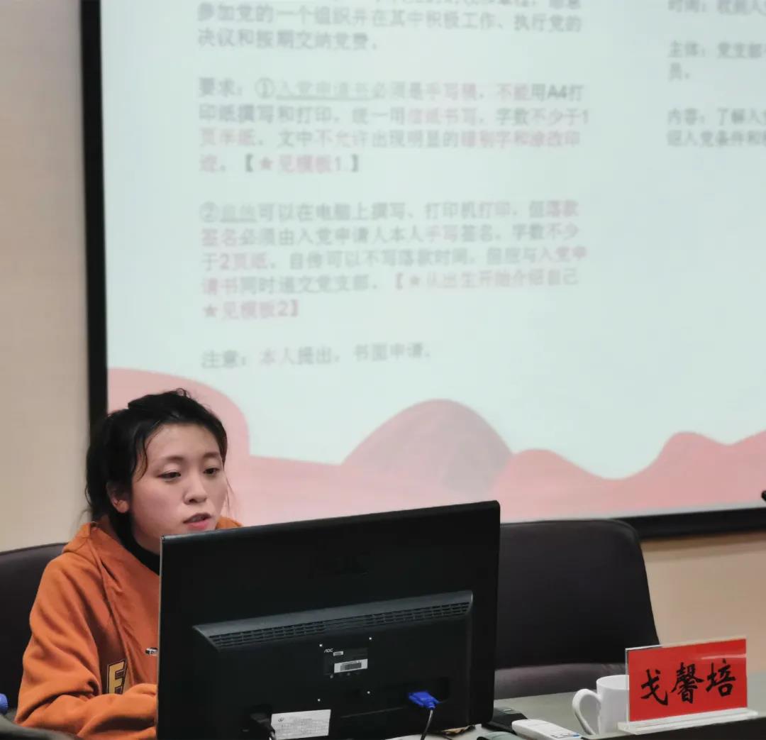 会议最后戈馨培同志为准备加入党组织的同志详细讲解了入党流程、入党申请书规范格式和注意事项。